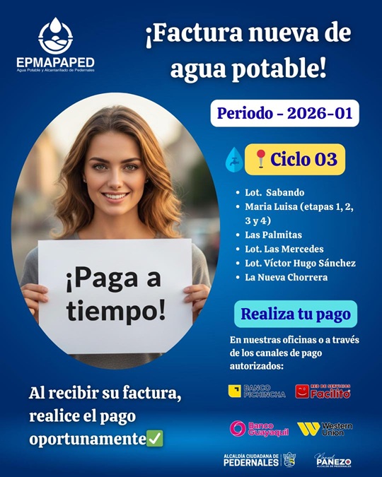 ¡Atención usuarios del Ciclo 3! Ya se encuentra disponible la nueva factura de agua potable del periodo 2026-01. Sectores: Lot.