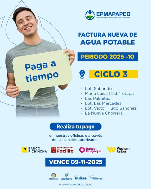 Ya se encuentra disponible la nueva factura de agua potable del periodo 2025-10. Sectores: Lot. Sabando María Luisa (etapas 1,